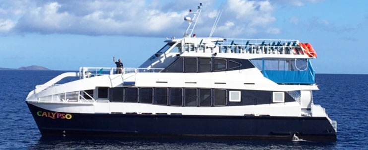 - The Calypso is a spacious, 149 passenger power catamaran designed by Incat Crowther in Australia and built by Navatek on the Island of Oahu. Some of the Calypso's most exciting features include two waterslides, including a "bow" water slide with an exciting drop, a jump platform on the third deck (known as the "leap of faith"), two freshwater showers, three restrooms (including an ADA accessible restroom), and "soft deck" flooring throughout all decks, which is easy on the feet. There are 11 individual dive steps, each with its own hand rail for safe and convenient exit and entry into the water. The rear dive step is lowered into the water for ease of access. The Calypso features 4,000 square feet of comfortable and covered passenger seating spread throughout three separate decks. The vessel also has a dedicated glass bottom viewing room with passenger seating and large glass bottom viewing windows.